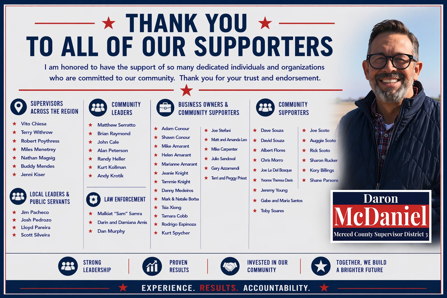 Daron McDaniel has proudly served Merced County’s District 3 since 2015, representing Atwater, North Merced, Franklin-Beachwood, and McSwain. A small-business owner and longtime resident, Daron is committed to safer neighborhoods, local jobs, and strong families.